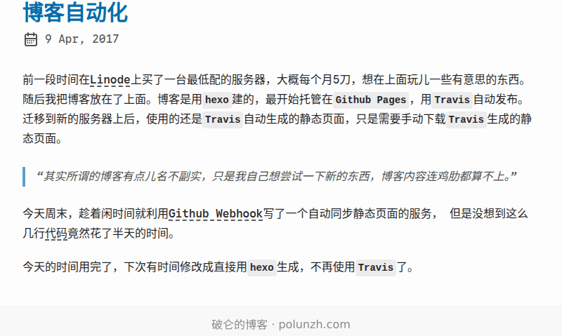 前一段时间在Linode上买了一台最低配的服务器,大概每个月5刀,想在上面玩儿一些有意思的东西。随后我把博客放在了上面。博客是用hexo建的,最开始托管在Github Pages,用Travis自动发布。迁移到新的服务器上后,使用的还是Travis自动生成的静态页面,只是需要手动下载Travis生成的静态页面。