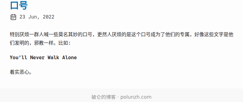 特别厌烦一群人喊一些莫名其妙的口号,更然人厌烦的是这个口号成为了他们的专属,好像这些文字是他们发明的,邪教一样。比如: