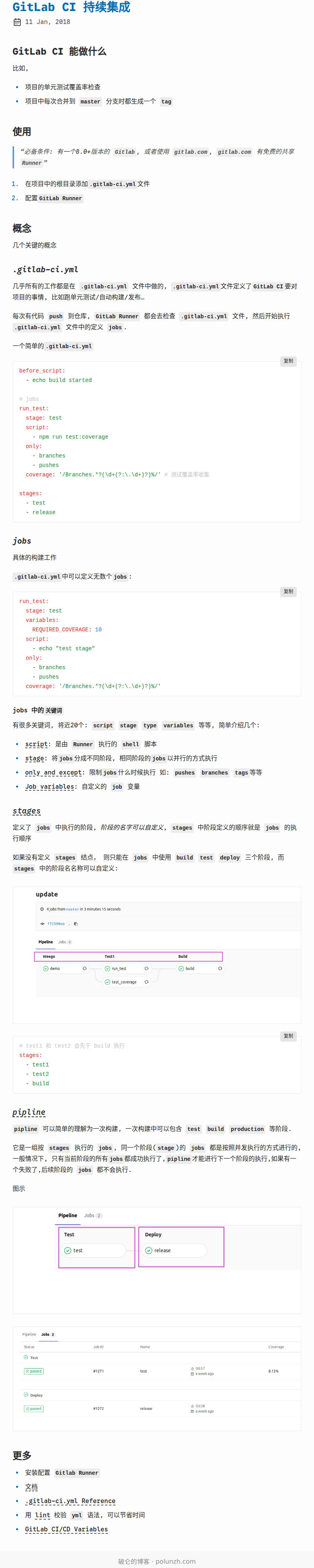 几乎所有的工作都是在 .gitlab-ci.yml 文件中做的, .gitlab-ci.yml文件定义了GitLab CI要对项目的事情, 比如跑单元测试/自动构建/发布…