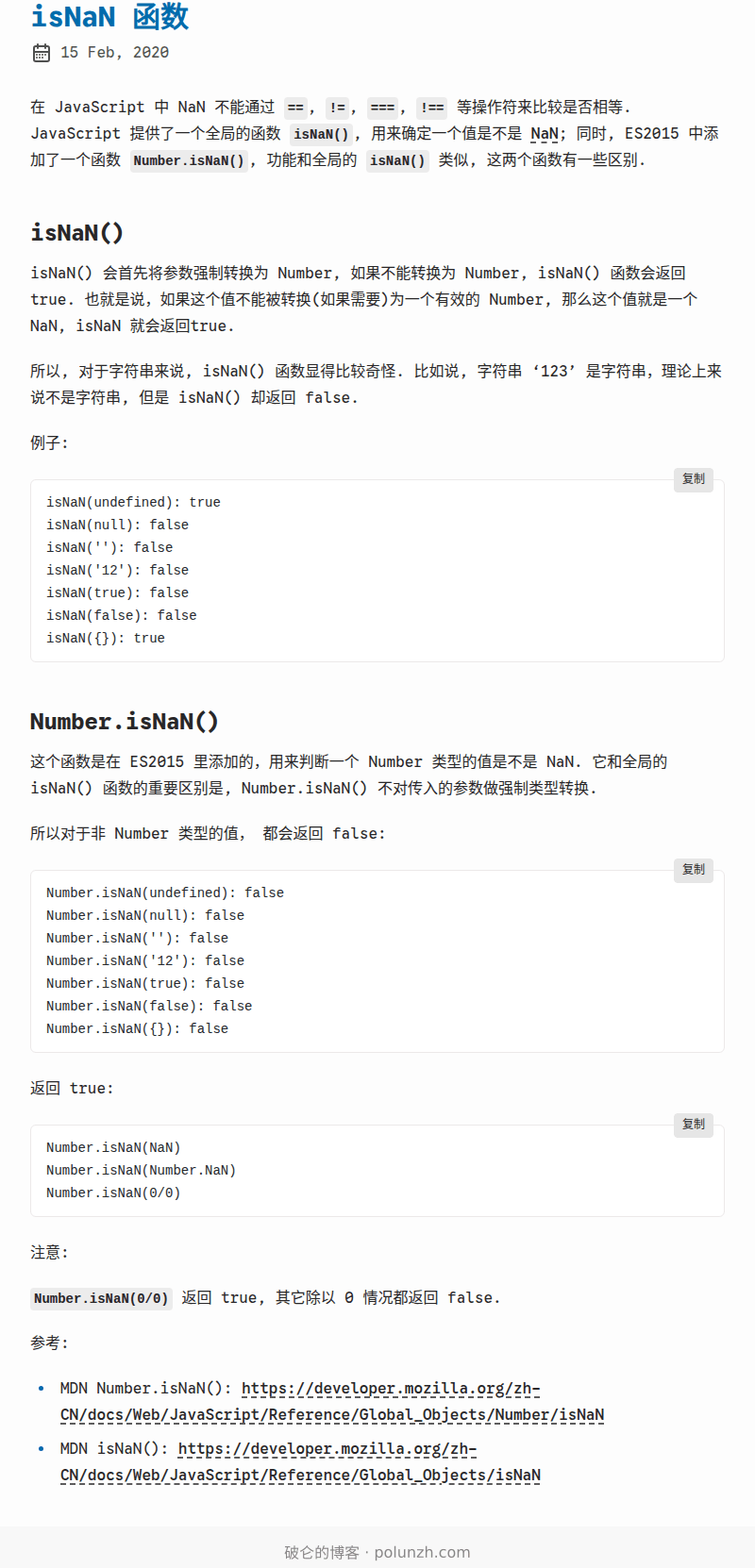 在 JavaScript 中 NaN 不能通过 ==, !=, ===, !== 等操作符来比较是否相等. JavaScript 提供了一个全局的函数 isNaN(), 用来确定一个值是不是 NaN; 同时, ES2015 中添加了一个函数 Number.isNaN(), 功能和全局的 isNaN() 类似, 这两个函数有一些区别.