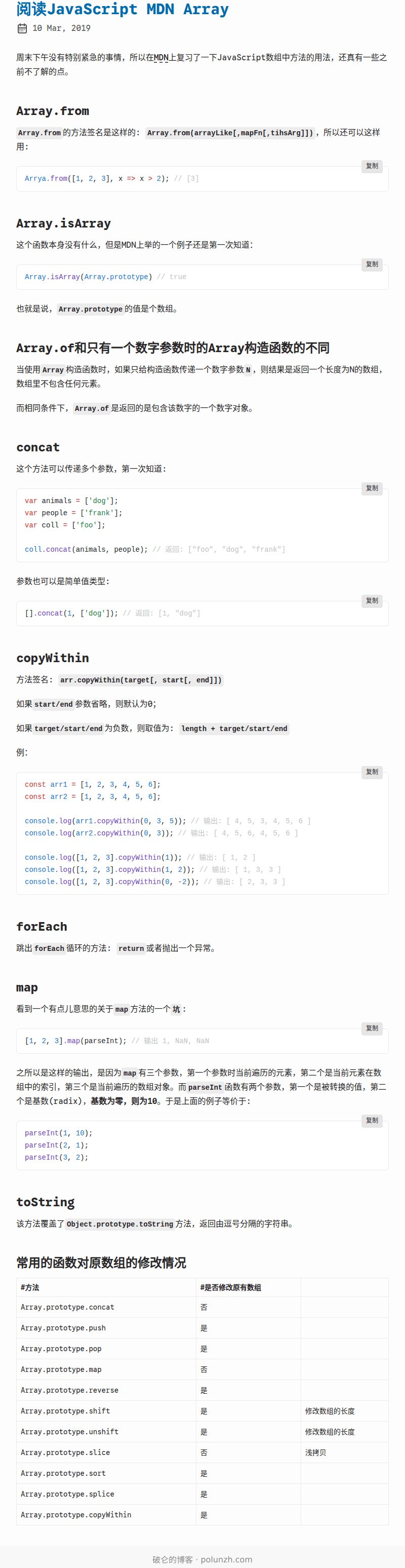 周末下午没有特别紧急的事情,所以在MDN上复习了一下JavaScript数组中方法的用法,还真有一些之前不了解的点。
