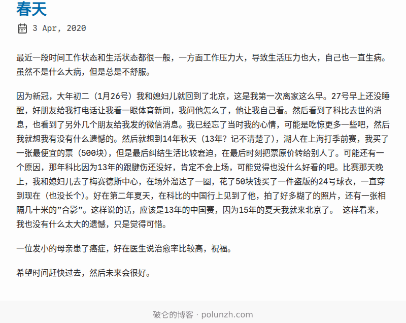 因为新冠,大年初二(1月26号)我和媳妇儿就回到了北京,这是我第一次离家这么早。27号早上还没睡醒,好朋友给我打电话让我看一眼体育新闻,我问他怎么了,他让我自己看。然后看到了科比去世的消息,也看到了另外几个朋友给我发的微信消息。我已经忘了当时我的心情,可能是吃惊更多一些吧,然后我就想我有没有什么遗憾的。然后就想到14年秋天(13年?记不清楚了),湖人在上海打季前赛,我买了一张最便宜的票(500块),但是最后纠结生活比较窘迫,在最后时刻把票原价转给别人了。可能还有一个原因,那年科比因为13年的跟腱伤还没好,肯定不会上场,可能觉得也没什么好看的吧。比赛那天晚上,我和媳妇儿去了梅赛德斯中心,在场外溜达了一圈,花了50块钱买了一件盗版的24号球衣,一直穿到现在(也没长个)。好在第二年夏天,在科比的中国行上见到了他,拍了好多糊了的照片,还有一张相隔几十米的”合影”。这样说的话,应该是13年的中国赛,因为15年的夏天我就来北京了。 这样看来,我也没有什么太大的遗憾,只是觉得可惜。