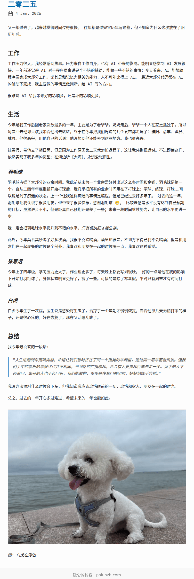羽毛球占据了大部分的业余时间。我此前从未为一个业余爱好付出过这么多时间和金钱,羽毛球是第一个。自从二四年年底重新开始打球后,我几乎把所有的业余时间用在了打球上:学球、练球、打球……可以说是到了痴迷的状态。上一个让我这样痴迷的事情是编程,但是已经过去好多年了。 过去的这一年,羽毛球让我认识了很多朋友,也带来了很多快乐,感谢羽毛球 😁。 比较遗憾是水平没有达到自己预期的目标,虽然进步不小,但是距离自己预期还是差了一些;未来一段时间继续努力,让自己的水平更进一步。