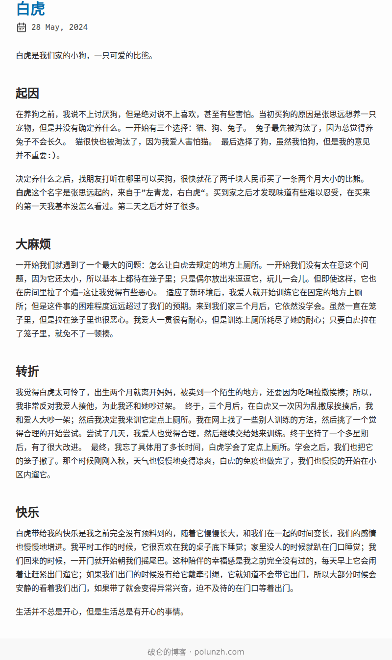 白虎带给我的快乐是我之前完全没有预料到的,随着它慢慢长大,和我们在一起的时间变长,我们的感情也慢慢地增进。我平时工作的时候,它很喜欢在我的桌子底下睡觉;家里没人的时候就趴在门口睡觉;我们回来的时候,一开门就开始朝我们摇尾巴。这种陪伴的幸福感是我之前完全没有过的,每天早上它会闹着让赶紧出门遛它;如果我们出门的时候没有给它戴牵引绳,它就知道不会带它出门,所以大部分时候会安静的看着我们出门,如果带了就会变得异常兴奋,迫不及待的在门口等着出门。