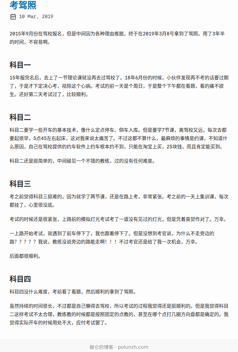 15年报完名后,去上了一节理论课就没再去过驾校了。18年6月份的时候,小伙伴发现再不考的话要过期了,于是才下定决心考,祛除这个心病。考试的前一天是个周日,于是整个下午都在看题,看的痛不欲生。还好第二天考试过了,比较顺利。