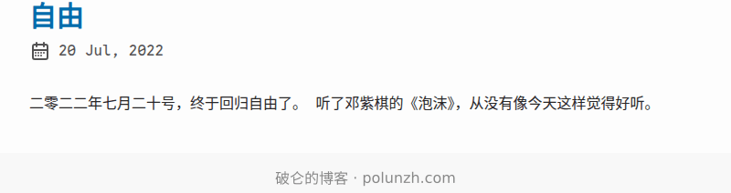 二零二二年七月二十号,终于回归自由了。 听了邓紫棋的《泡沫》,从没有像今天这样觉得好听。