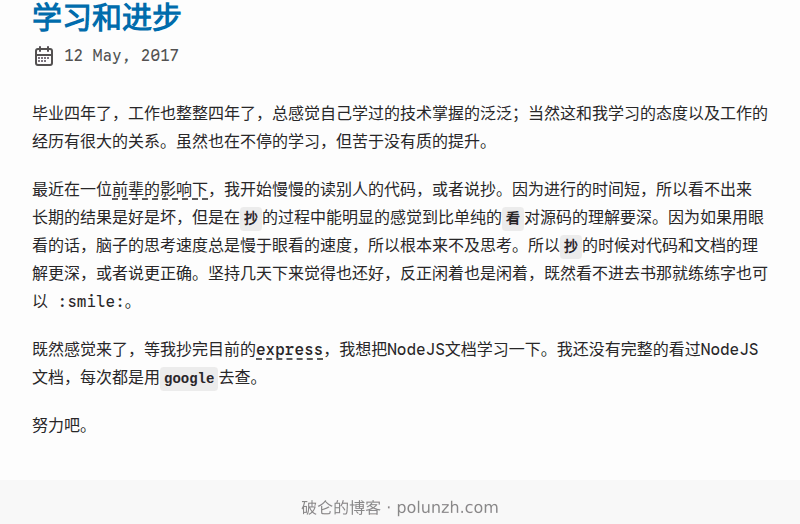 最近在一位前辈的影响下,我开始慢慢的读别人的代码,或者说抄。因为进行的时间短,所以看不出来长期的结果是好是坏,但是在抄的过程中能明显的感觉到比单纯的看对源码的理解要深。因为如果用眼看的话,脑子的思考速度总是慢于眼看的速度,所以根本来不及思考。所以抄的时候对代码和文档的理解更深,或者说更正确。坚持几天下来觉得也还好,反正闲着也是闲着,既然看不进去书那就练练字也可以 :smile:。