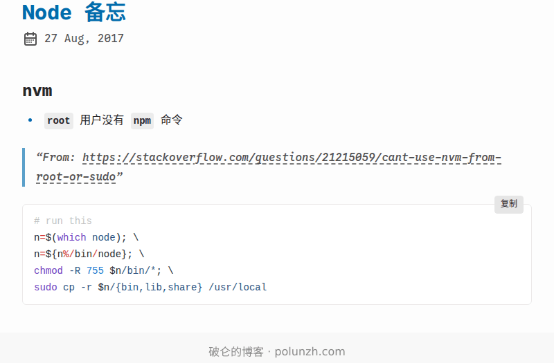 sudo cp -r $n/{bin,lib,share} /usr/local root 用户没有 npm 命令From: https://stackoverflow.com/questions/21215059/cant-use-nvm-from-root-or-sudo