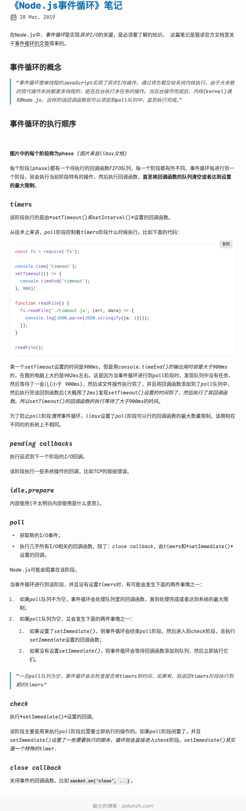 第一个setTimeout设置的时间是900ms,但是用console.timeEnd()的输出用时却是大于900ms的,在我的电脑上大约是902ms左右。这是因为当事件循环进行到poll阶段时,发现队列中没有任务,然后等待了一会儿(小于 900ms),然后读文件操作执行完了,并且将回调函数添加到了poll队列中,然后执行完该回到函数后(大概用了2ms)发现setTimeout()设置的时间到了,然后执行了其回调函数。所以setTimeout()的回调函数的执行等待了大于900ms的时间。