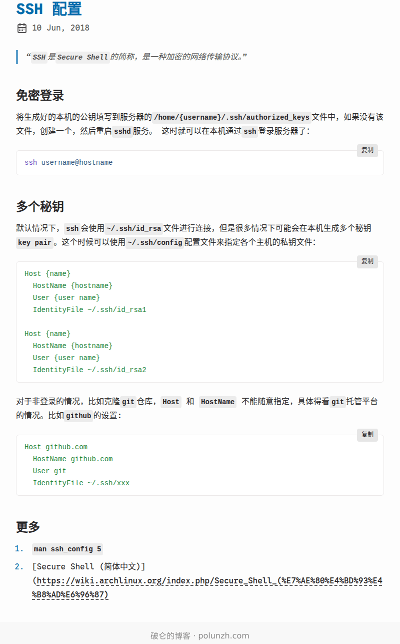 man ssh_config 5- [Secure Shell (简体中文)](https://wiki.archlinux.org/index.php/Secure_Shell_(%E7%AE%80%E4%BD%93%E4%B8%AD%E6%96%87)